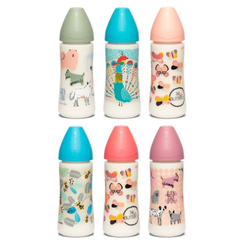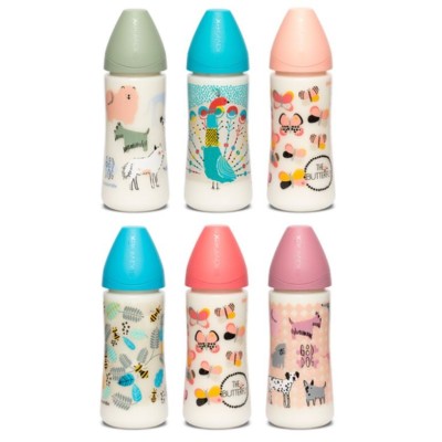 Biberón con botella con forma ergonómica y tetina redonda disponible en 3 posiciones de látex, que permite regular el flujo, o para papilla.